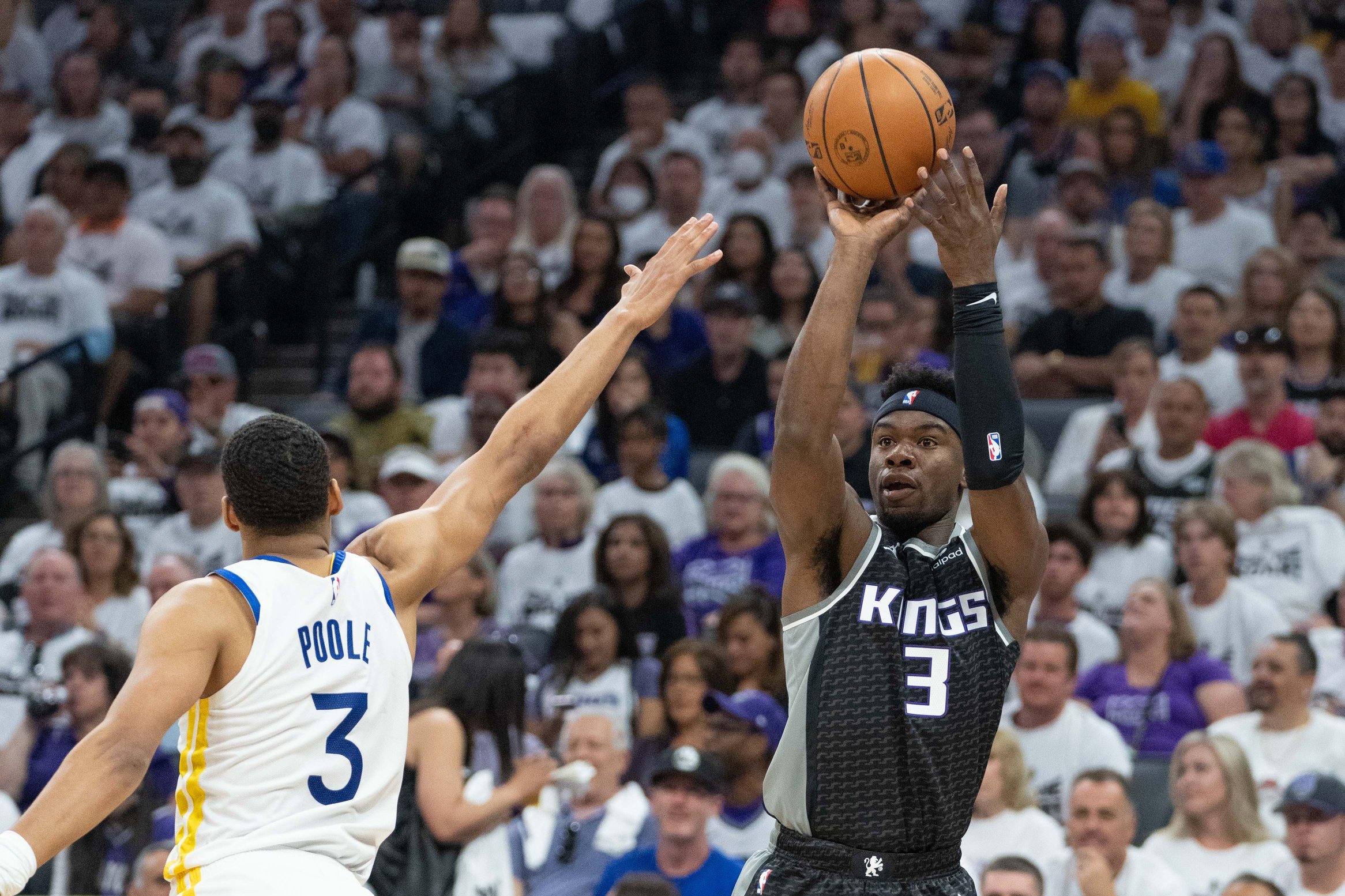 April 30, 2023; Sacramento, California, USA; Sacramento Kings guard Terence Davis (3) shoots the basketball during the first quarter in game seven of the 2023 NBA playoffs first round against the Sacramento Kings at Golden 1 Center. Mandatory Credit: Kyle Terada-USA TODAY Sports