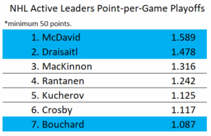 It’s somewhat hard to believe it took us so long to mention McDavid’s partner-in-crime, Dr. Drai. Studying the current best in terms of active players in points-per-game in the playoffs, the list is quite impressive for the Oilers.